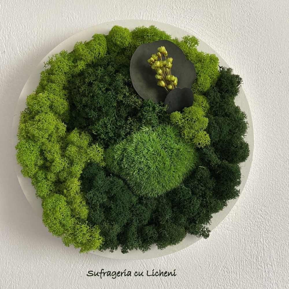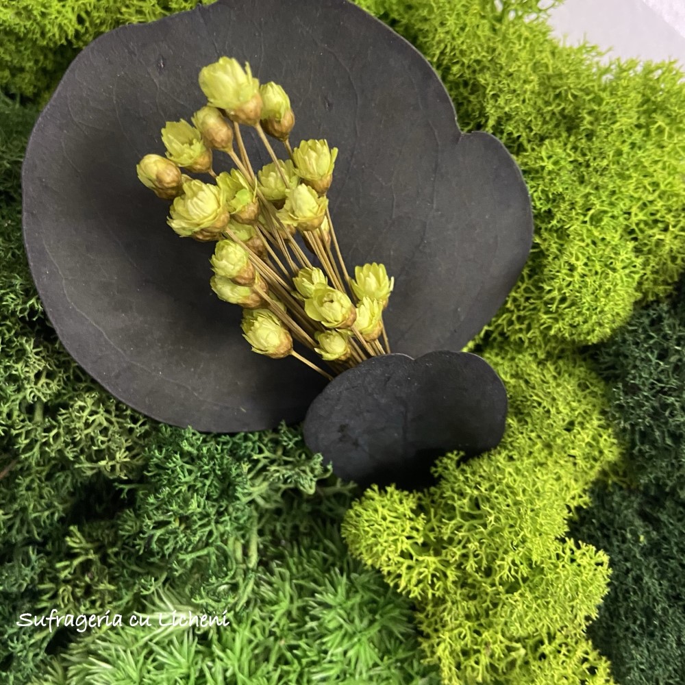 Materiale: Licheni stabilizați, mușchi bombați și mușchi creț, flori și frunze uscate sau stabilizate.