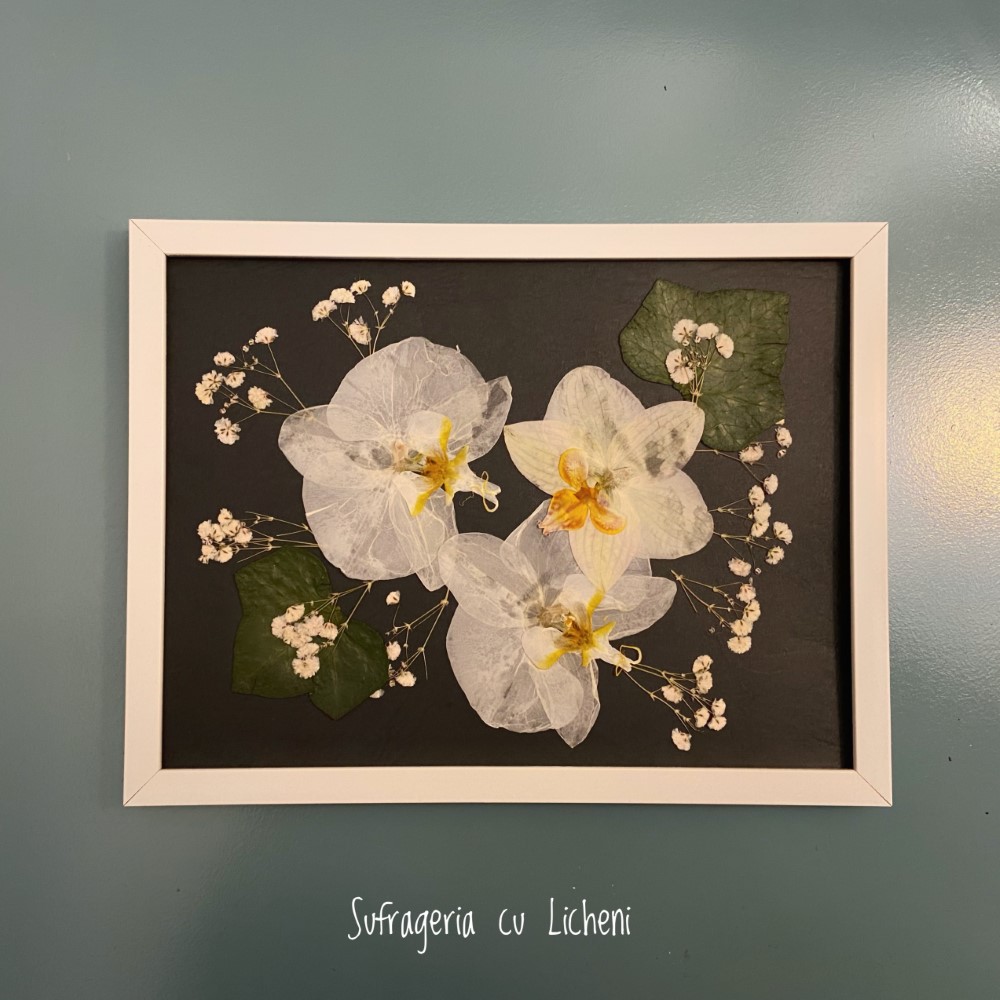 Materiale: Flori naturale presate: orhidee, gypsophila, iederă.