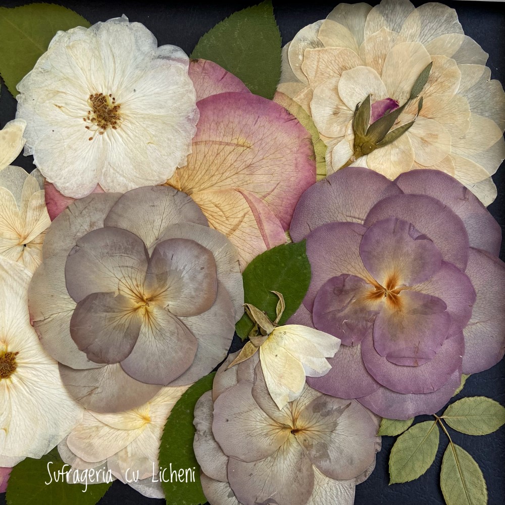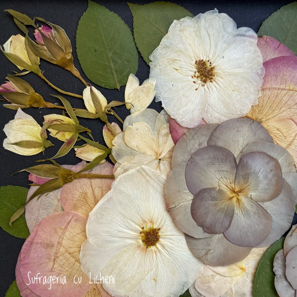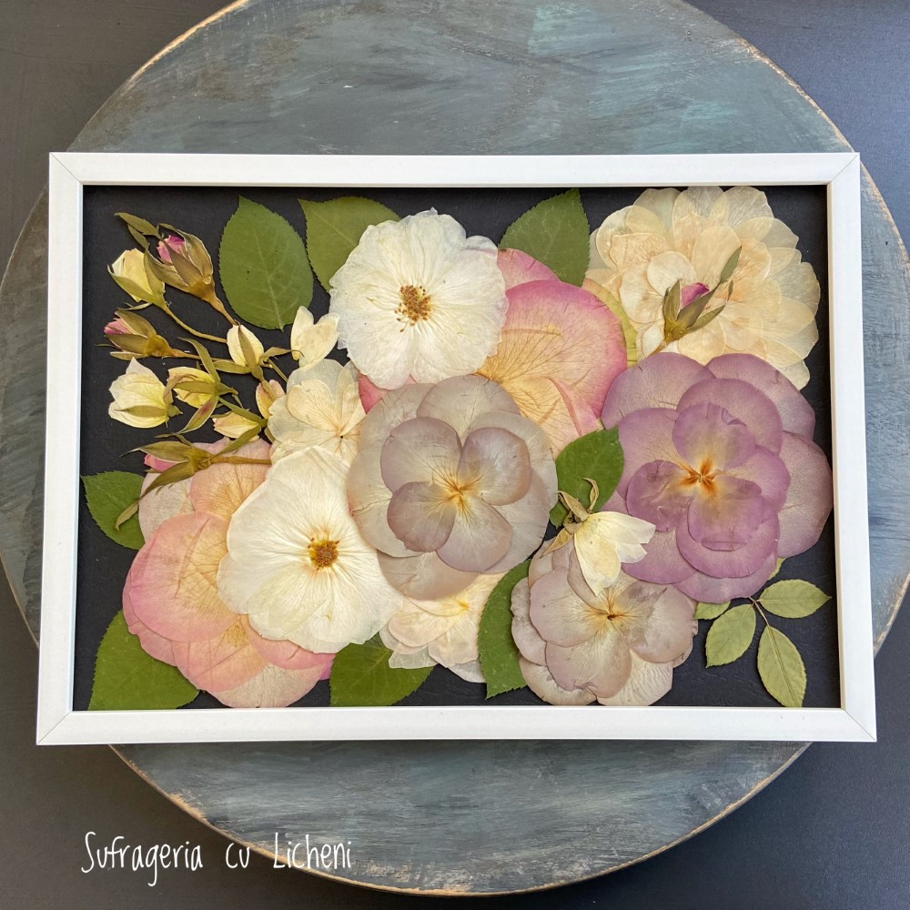 Materiale: Flori naturale presate: trandafiri, foliaj.