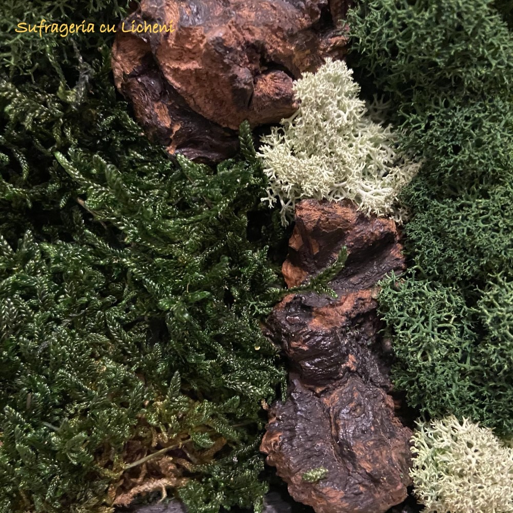 Materiale: Mușchi creț, mușchi plat, licheni stabilizați, flori uscate, și elemente din natură