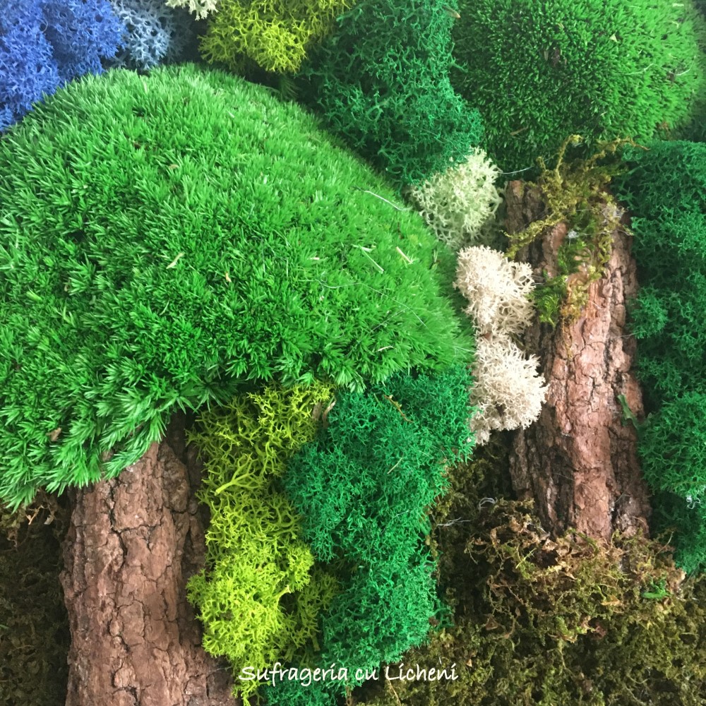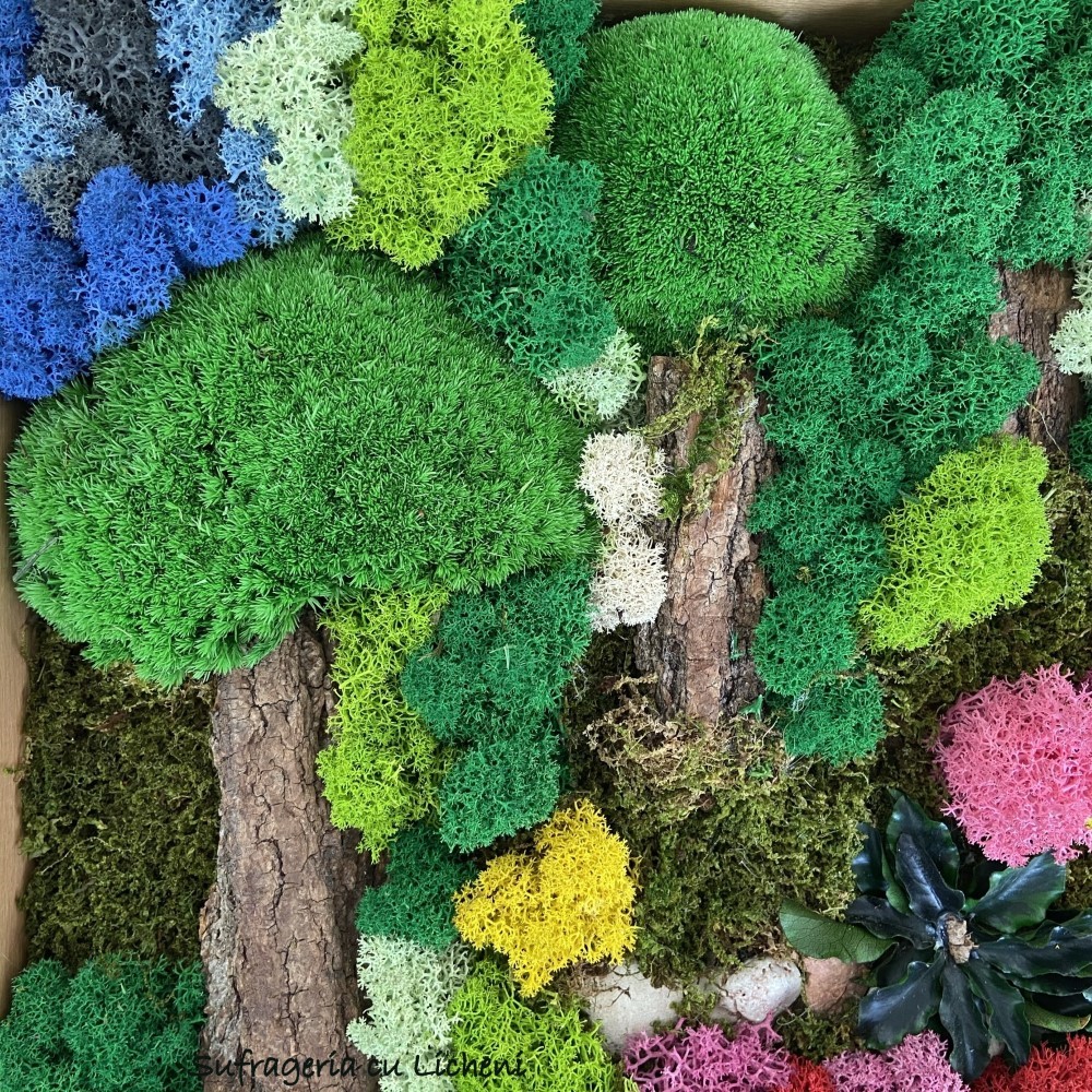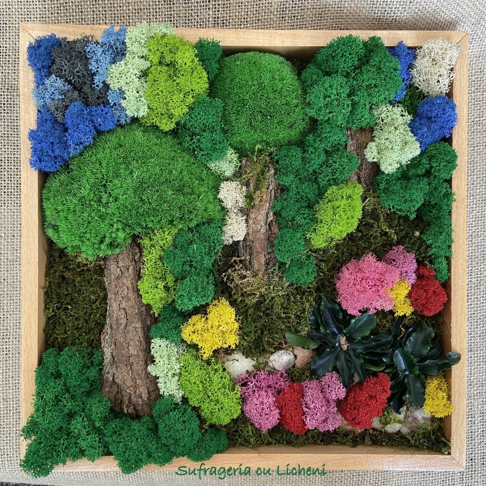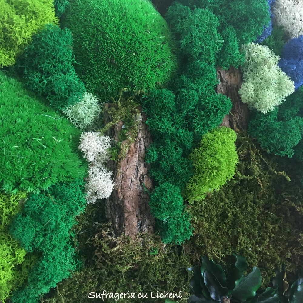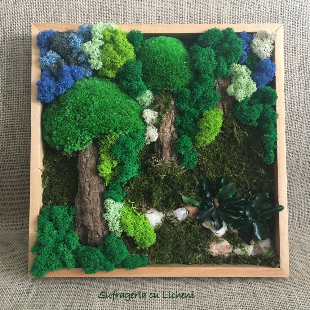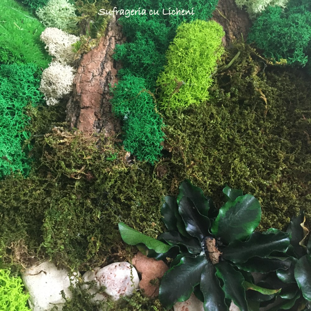 Materiale: Licheni stabilizați , mușchi plat, mușchi bombat, scoarța copac, alte elemente din natura. Rama fag.