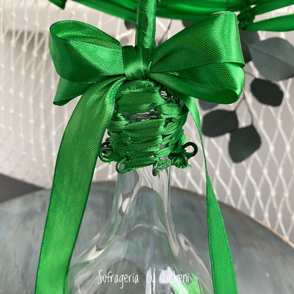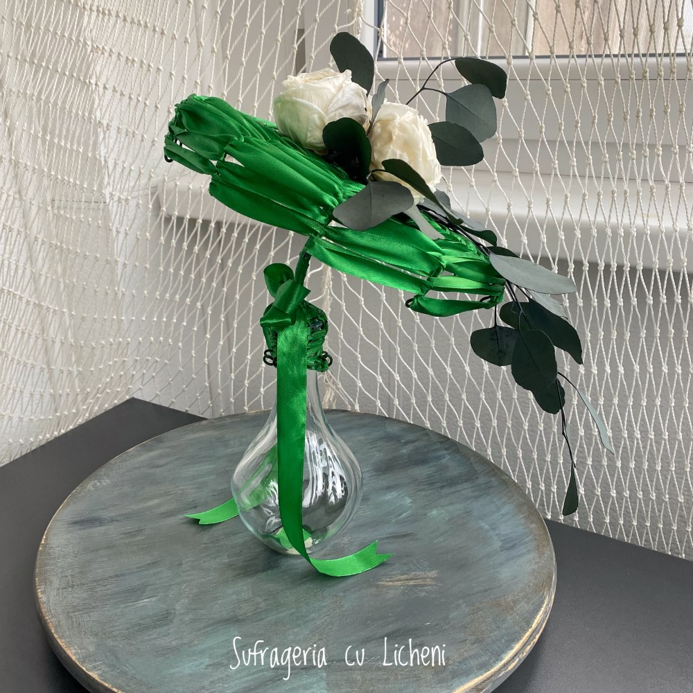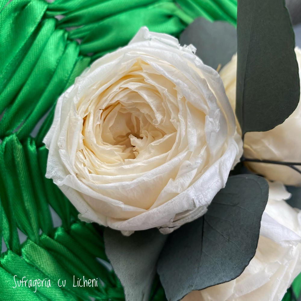 Materiale: Bujori stabilizați, eucalipt stabilizat. Aranjament creat pe structură spider-web.