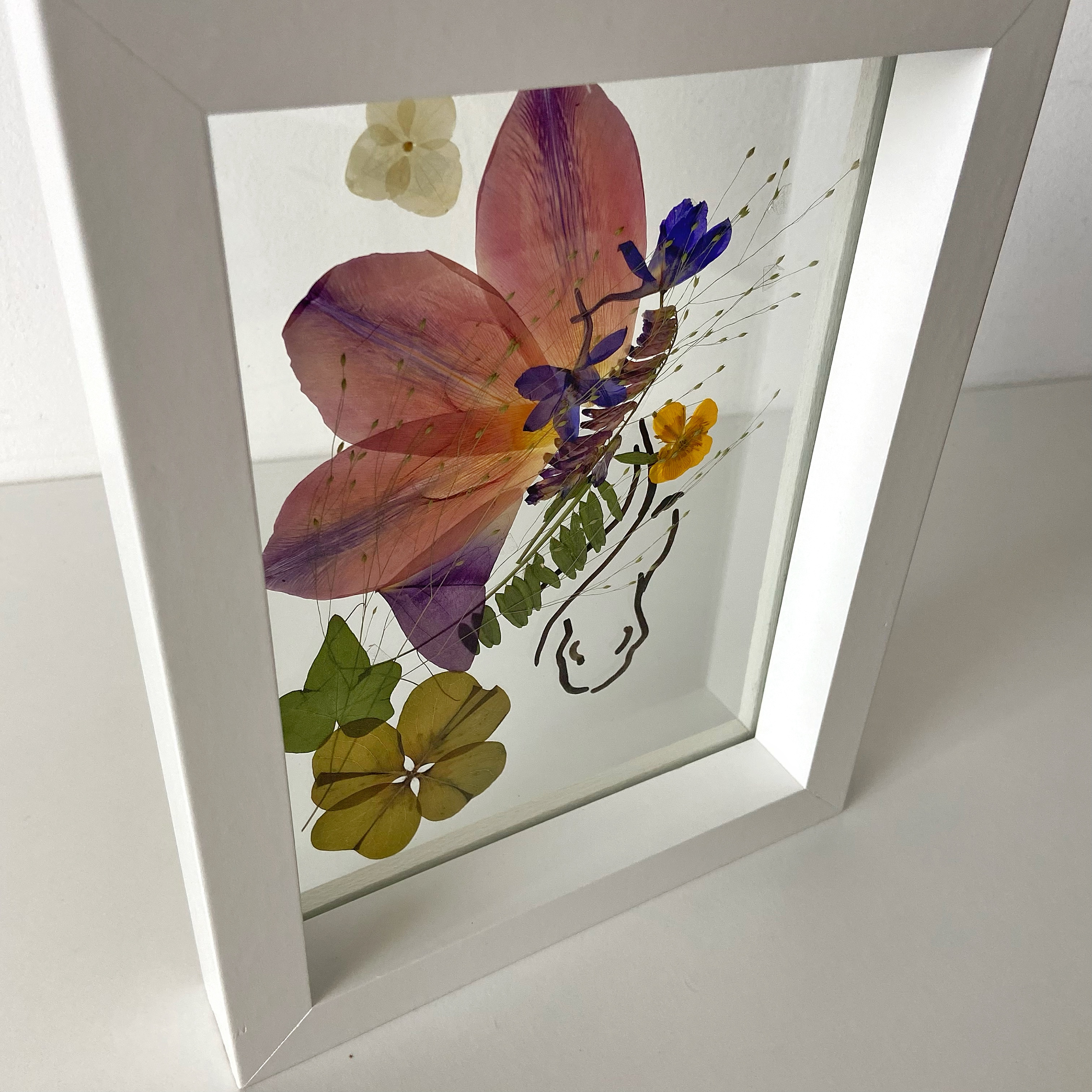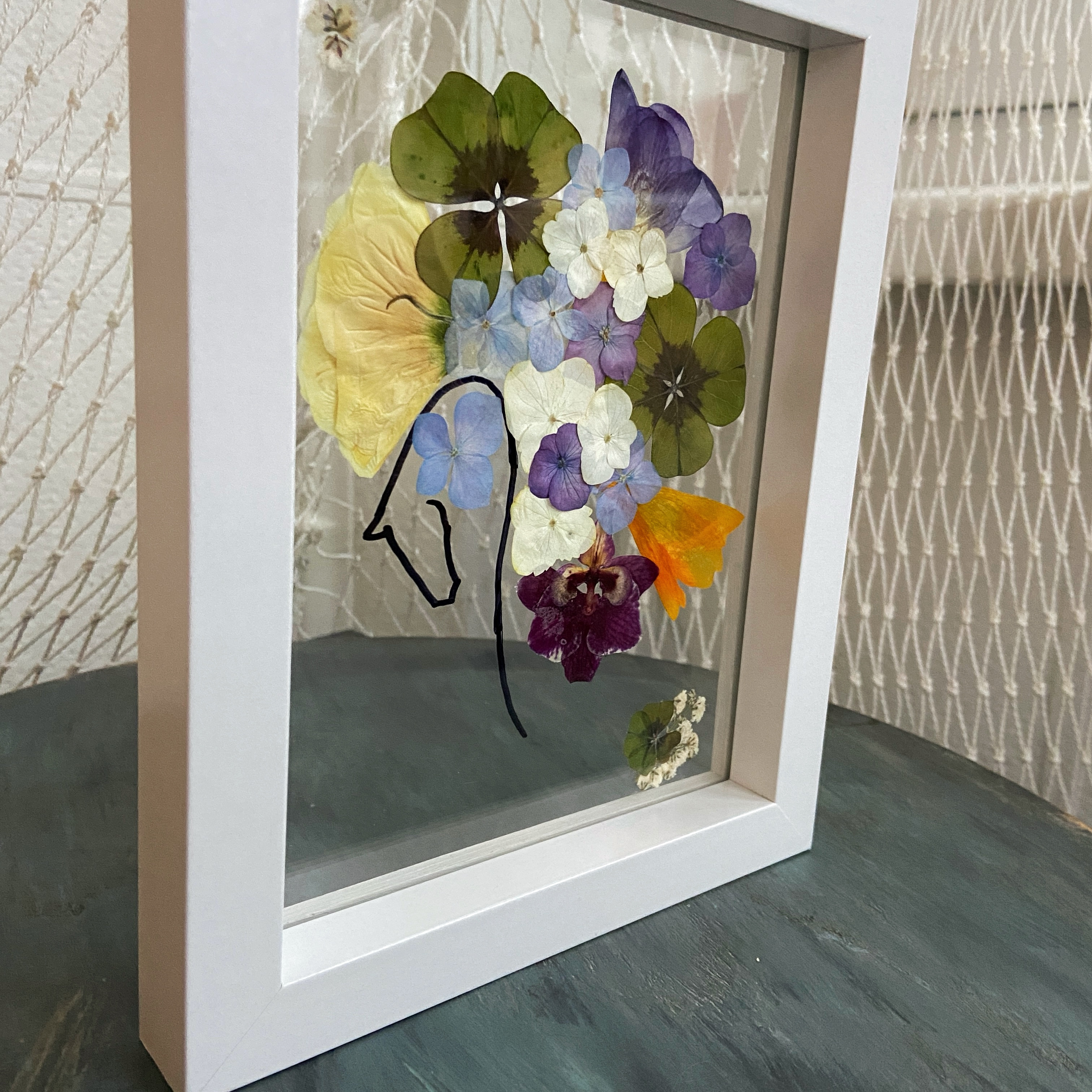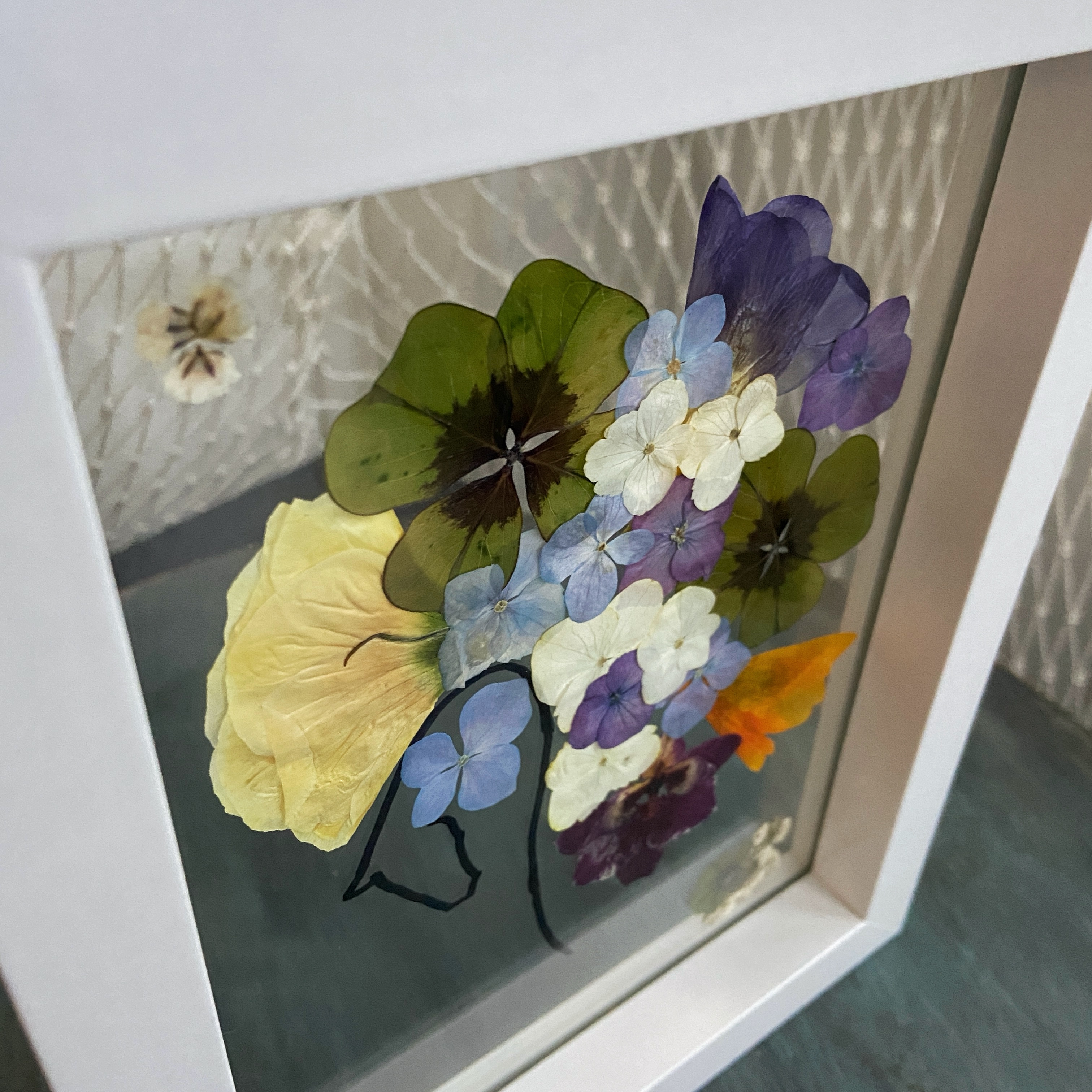 Materiale: Flori naturale presate, foliaj: Frezie, eustoma, orhidee, gypsophila, hydrangea, oxalis.